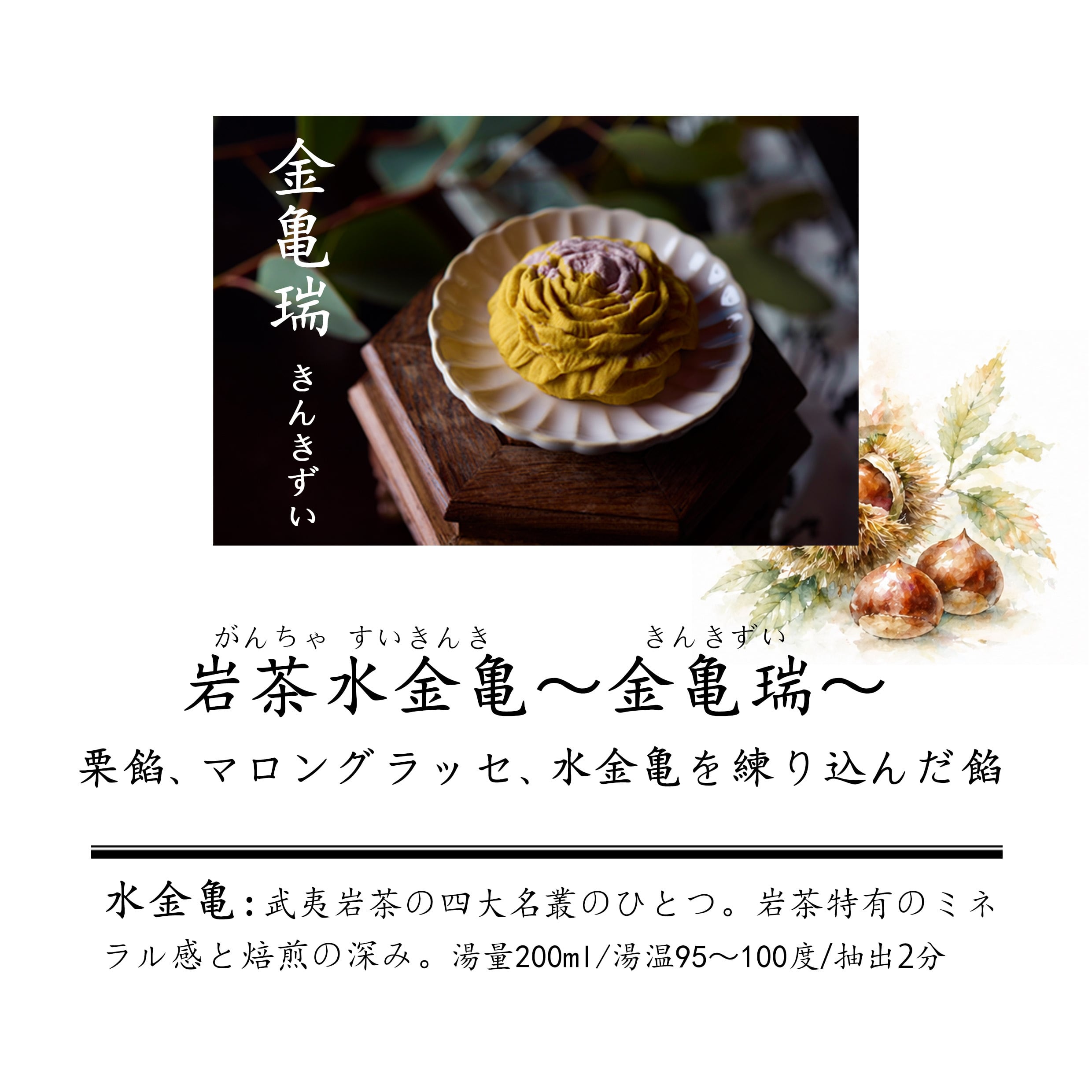 「金亀瑞(きんきずい)」は、栗きんとん餡のやさしい甘みにマロングラッセのコクと粒感を重ね、